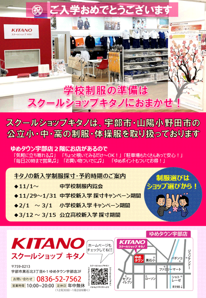 スクールショップキタノは、宇部市・山陽小野田市の学生服専門店です。